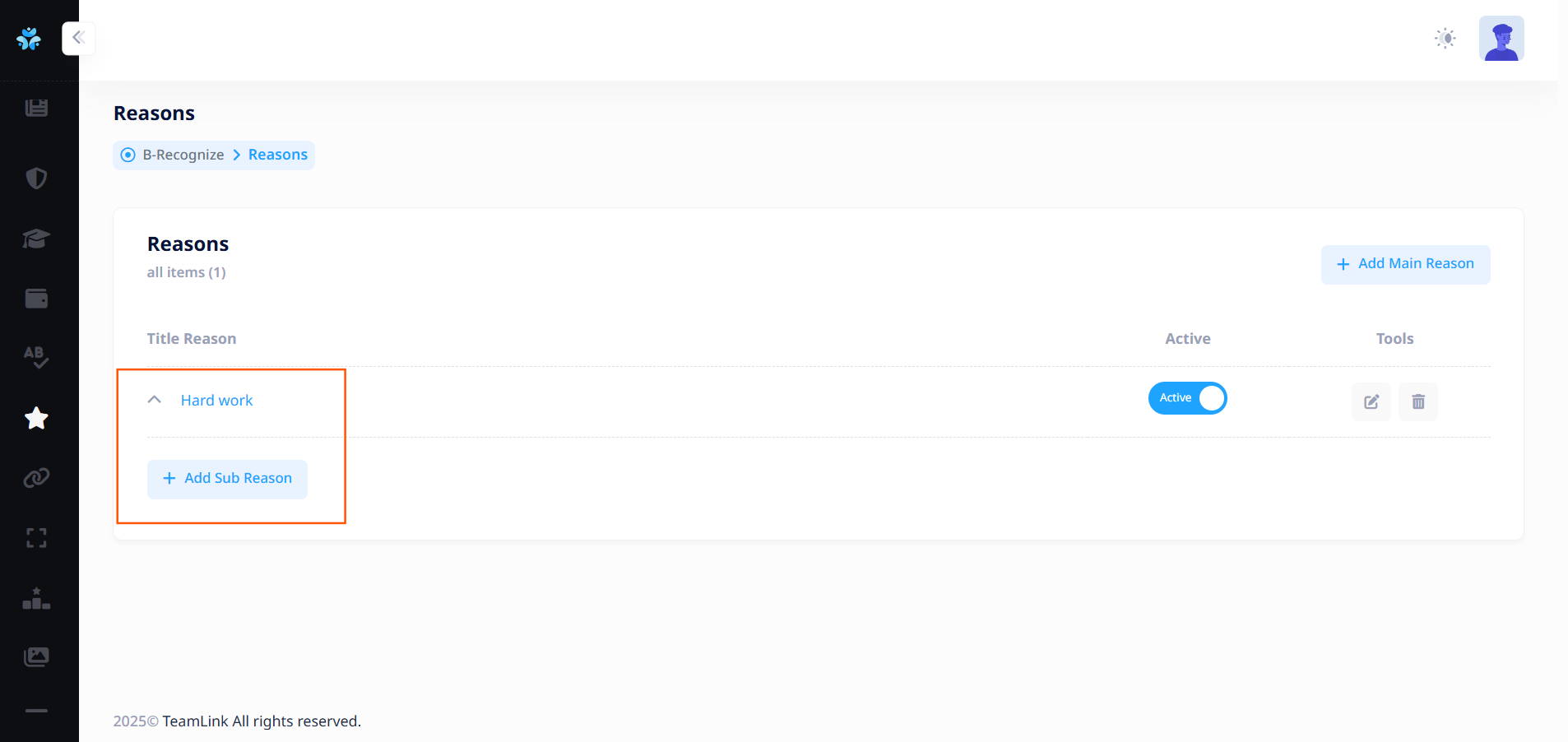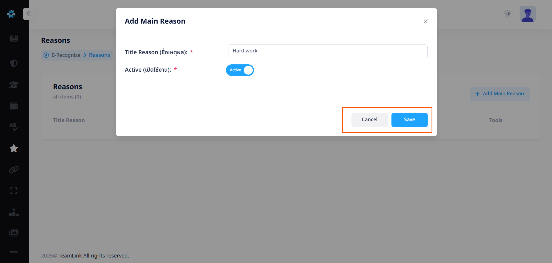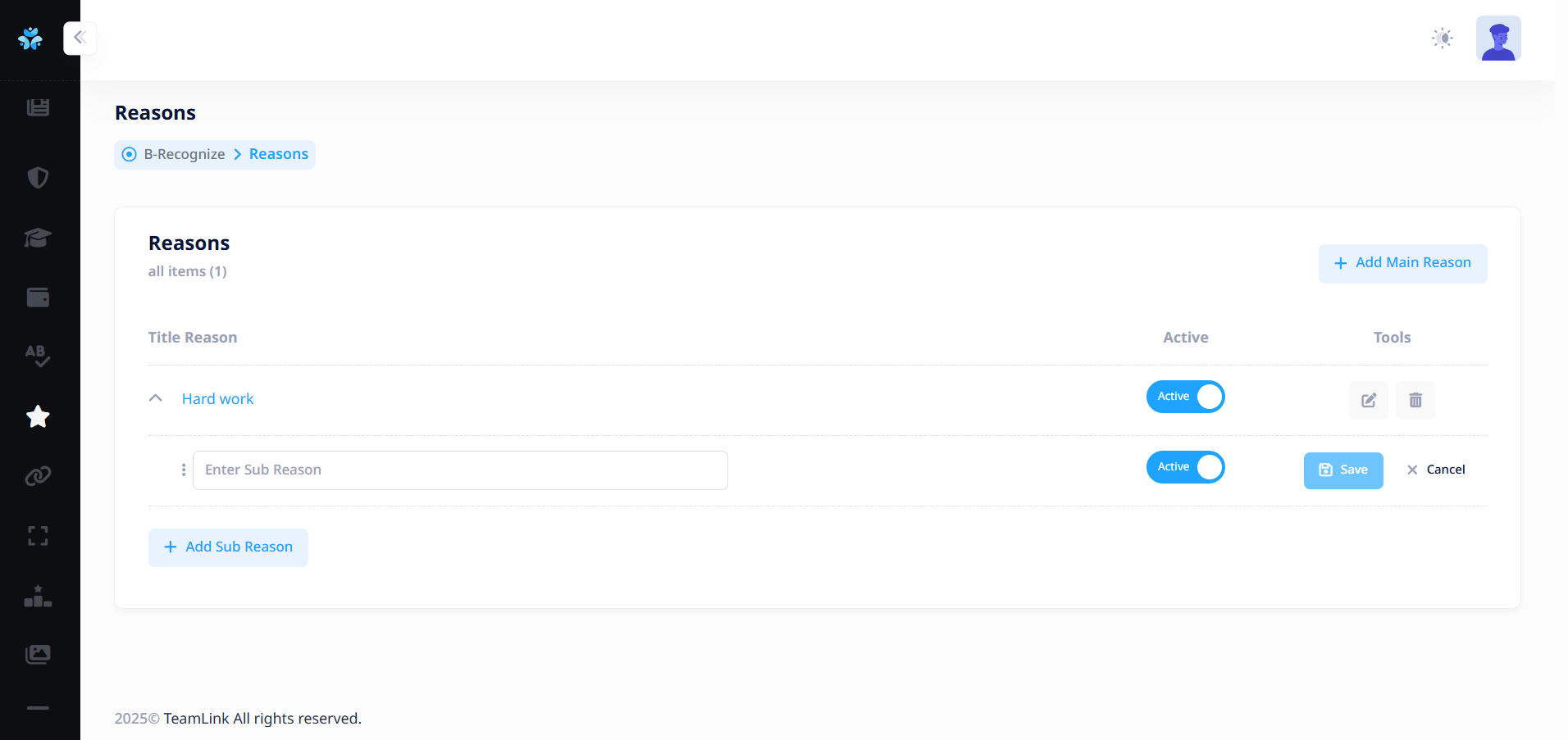 ผู้ใช้งานจำเป็นต้องเพิ่มเหตุผลย่อยประกอบ เพื่อเป็นตัวเลือกให้พนักงานที่มอบดาวให้กับผู้อื่นเลือก หากไม่มีเหตุผลย่อย ระบบจะไม่สามารถให้ดาวได้