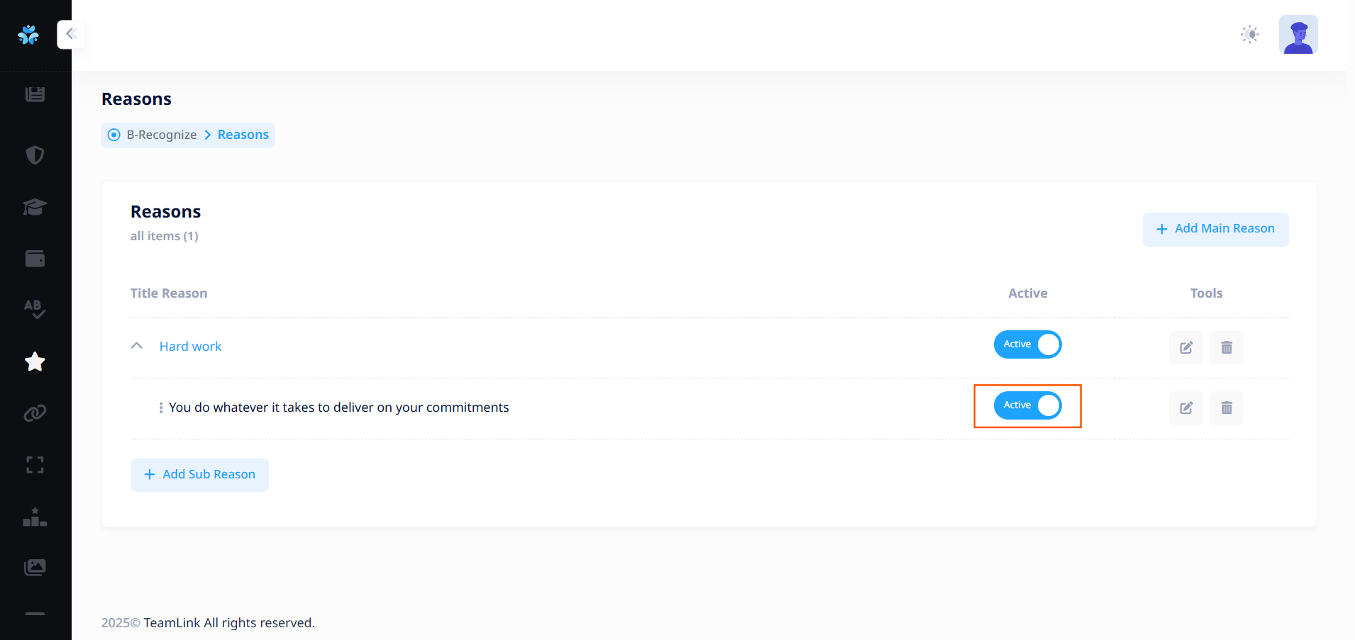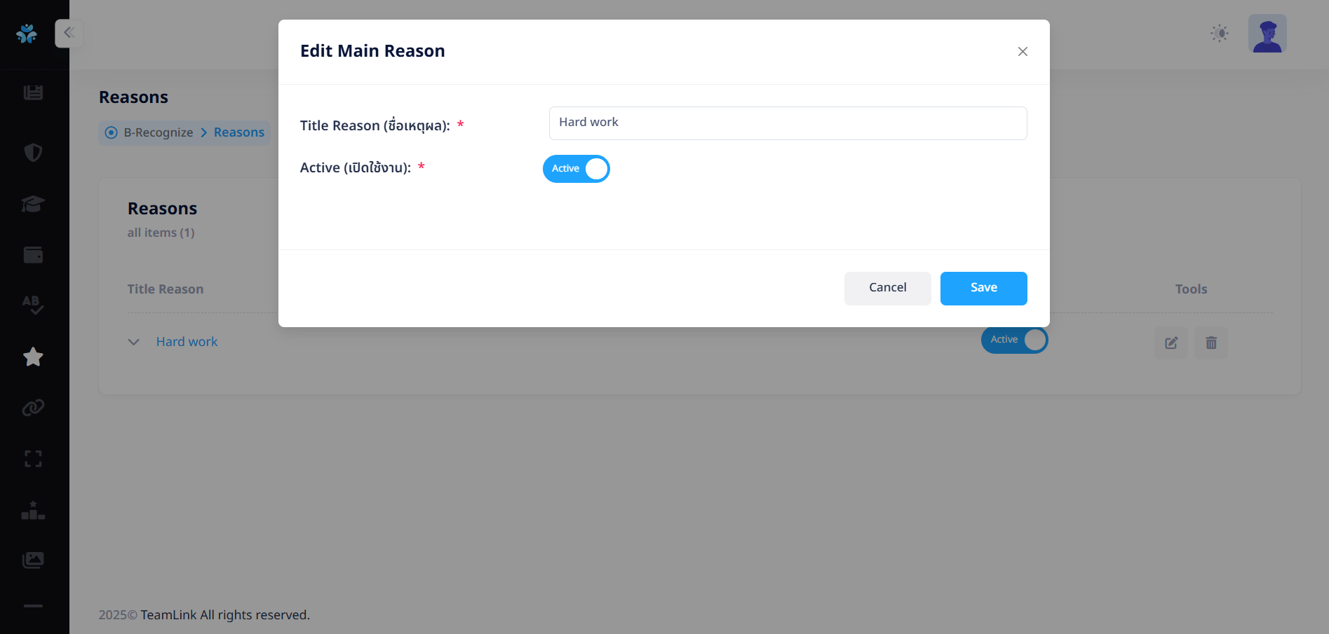ที่คอลัมน์ Active เพื่อเปิด-ปิดการมองเห็นของเหตุผลหลักได้ ซึ่งจะมีผลต่อการปรากฏบนหน้าแอปพลิเคชัน (และหากเหตุผลหลักดังกล่าวมีเหตุผลย่อย ระบบจะทำการปิดการมองเห็นของทั้งกลุ่มรวมถึงเหตุผลย่อยด้วย)