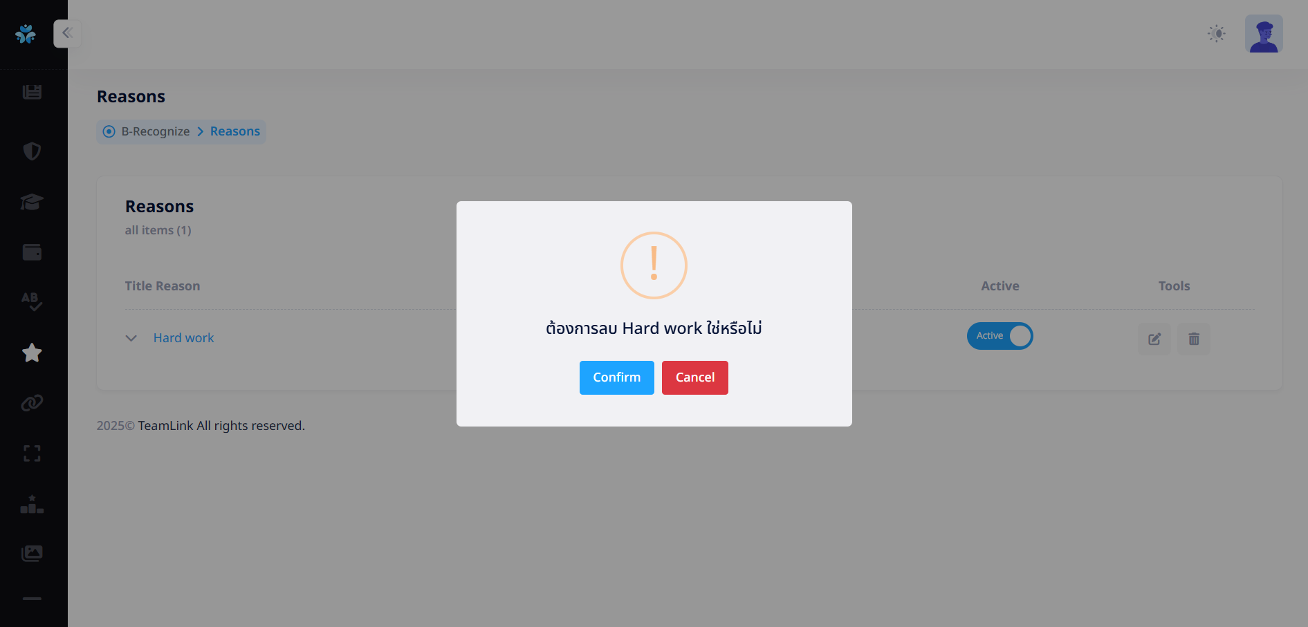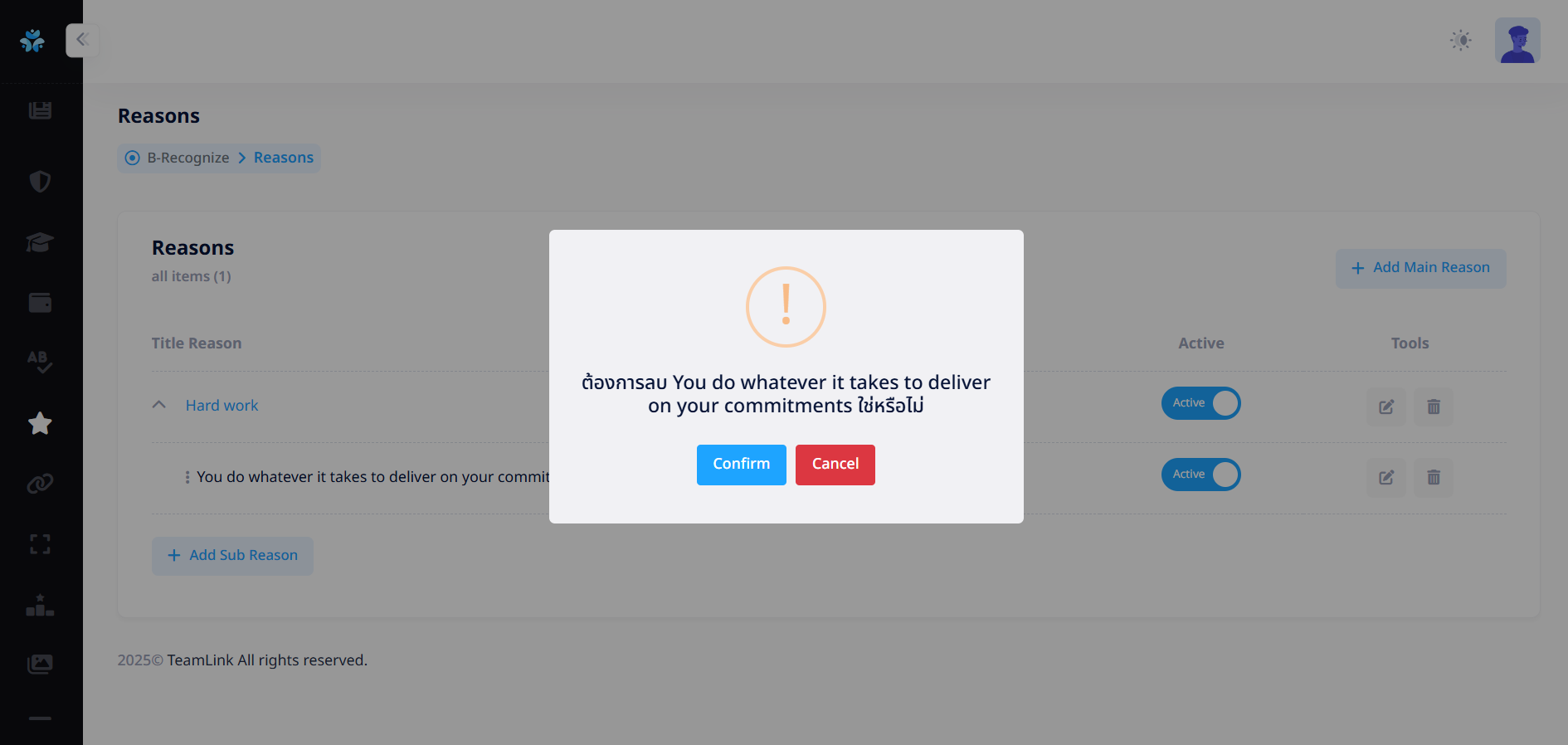 ที่คอลัมน์ Tool เพื่อลบเหตุผลย่อยได้ หลังจากกดปุ่มจะแสดง Pop up ดังรูป