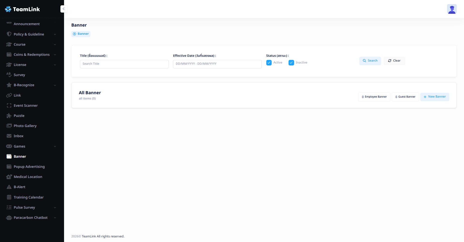 ผู้ใช้งานสามารถค้นหาแบนเนอร์ได้โดยพิมพ์ ชื่องาน (Title) ที่ต้องการลงในช่องค้นหา และกดปุ่ม "Search" เพื่อแสดงผลลัพธ์ที่เกี่ยวข้อง และสามารถกดปุ่ม "Clear" เพื่อล้างการค้นหาก่อนหน้า