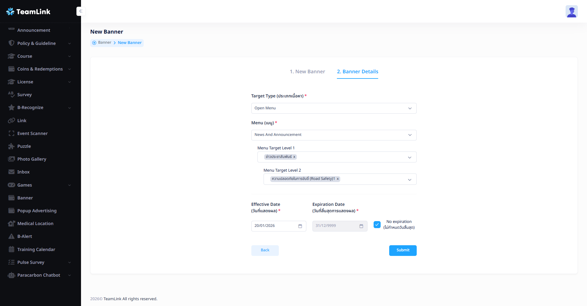 - Target Type Type (ประเภทเนื้อหา) : เลือกสิ่งที่จะเกิดขึ้นเมื่อกดที่แบนเนอร์