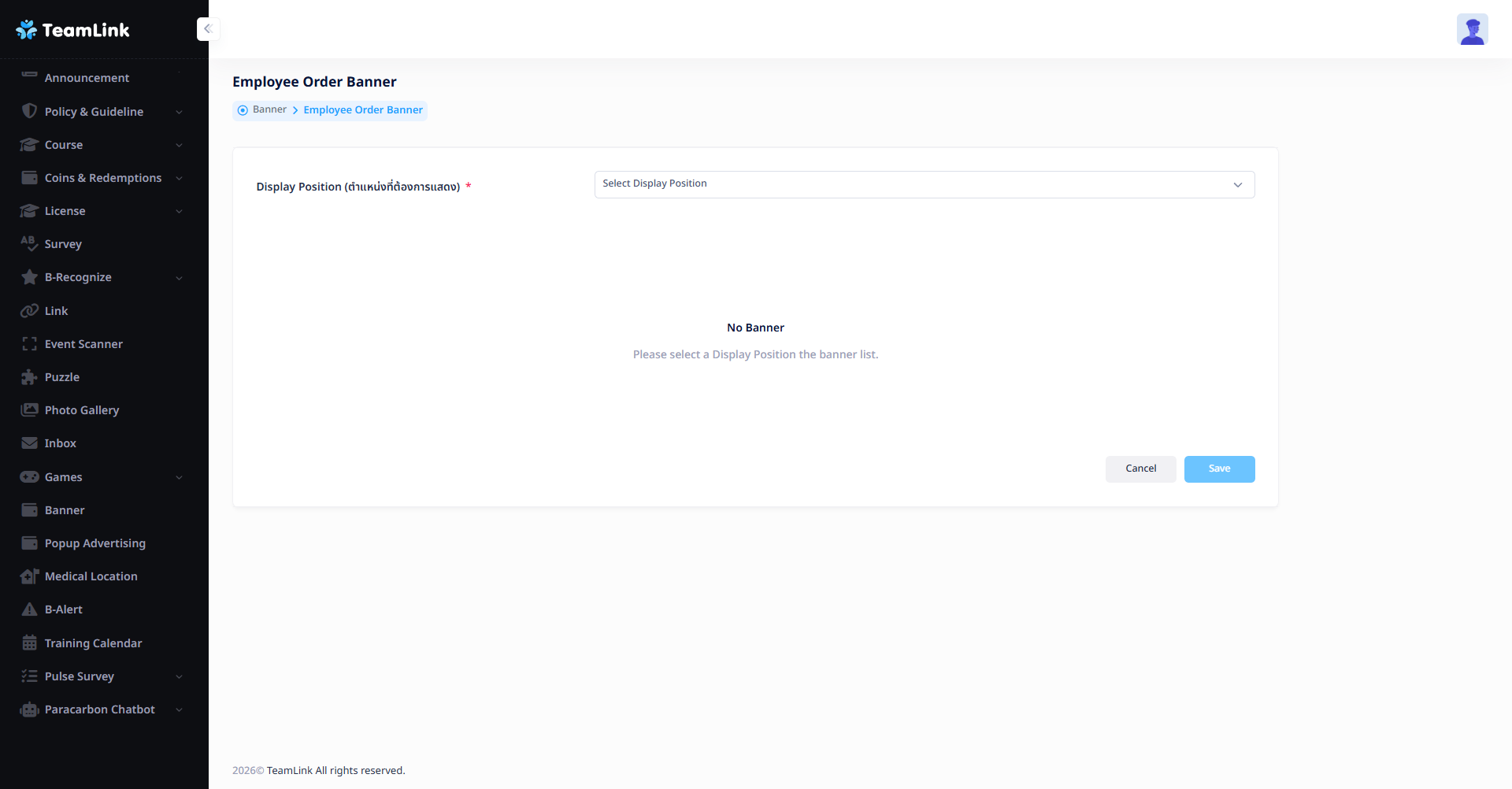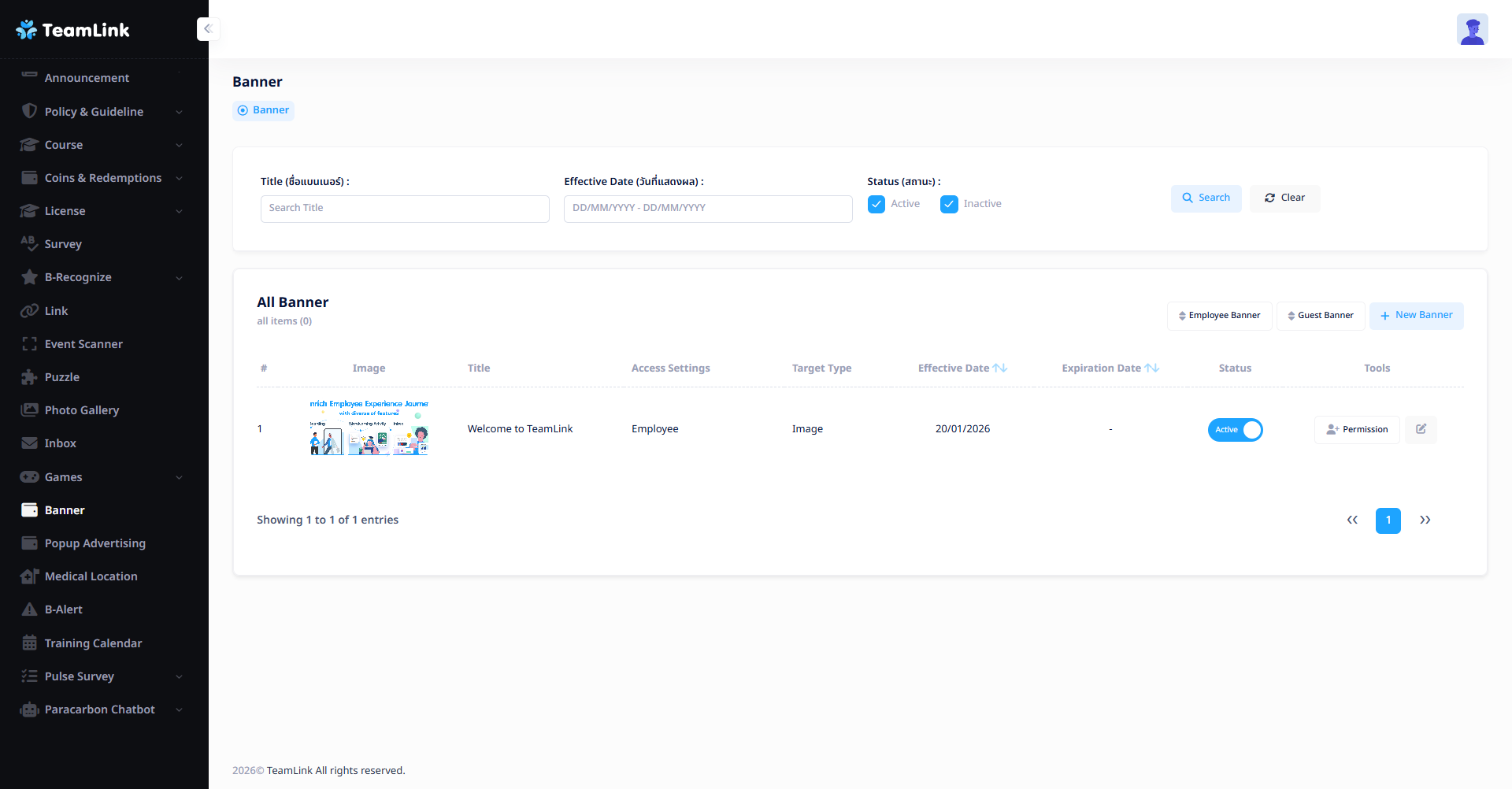 เมนูสำหรับเพิ่มแบนเนอร์สำหรับสื่อสารในองค์กรโดยผู้ดูแลระบบ (Admin) หรือผู้ที่ได้รับสิทธิ์ สามารถนำแบนเนอร์ขึ้นแสดงบนหน้าแอปพลิเคชันได้ และสามารถเพิ่มแบนเนอร์ที่แตกต่างกันแยกตามกลุ่มผู้อ่านได้ โดยผู้อ่านจะถูกแบ่งออกเป็น 2 กลุ่ม ได้แก่