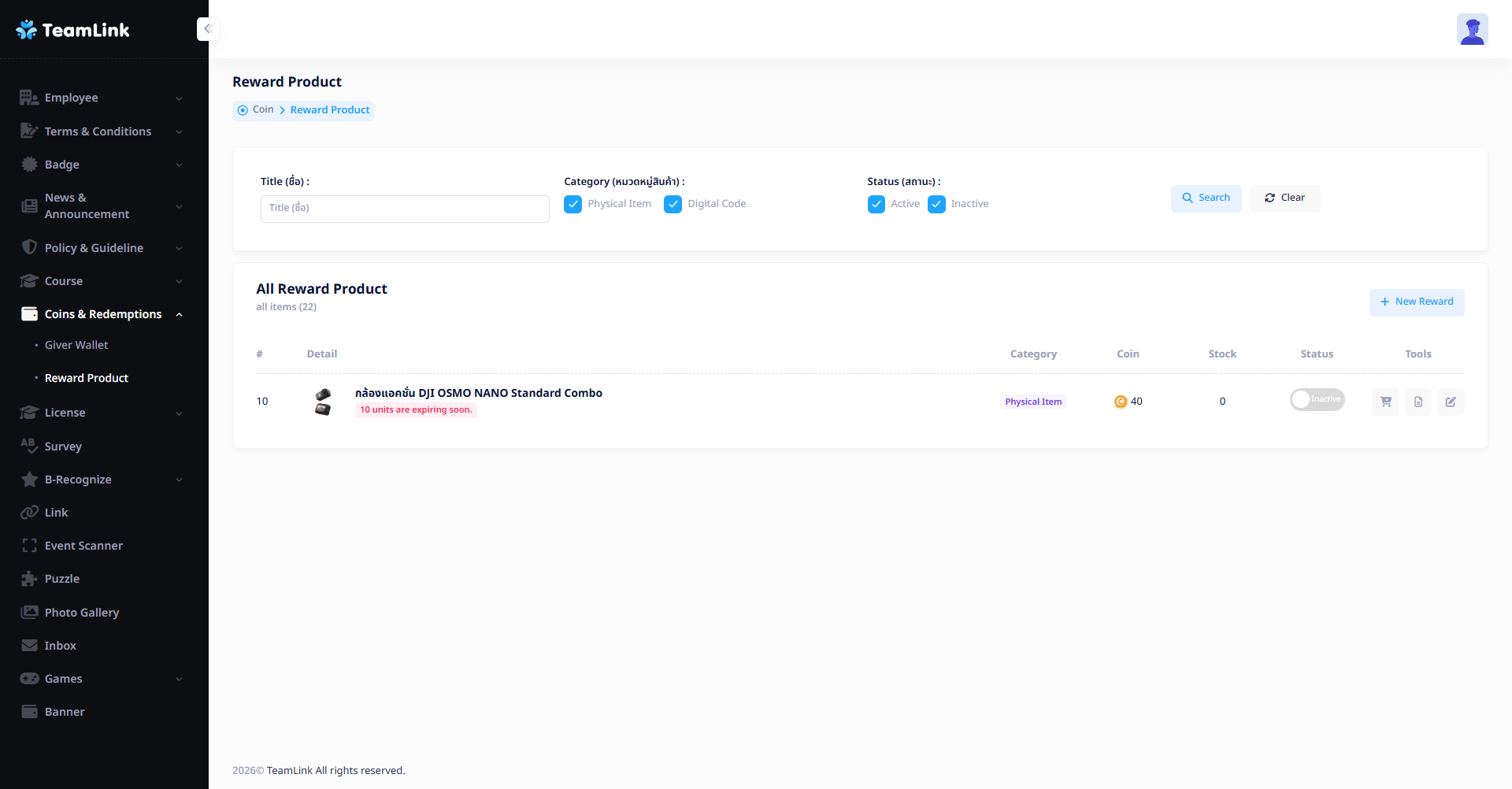 • Expired (หมดอายุ) : แสดงจำนวนของรางวัลที่หมดเวลาแลก