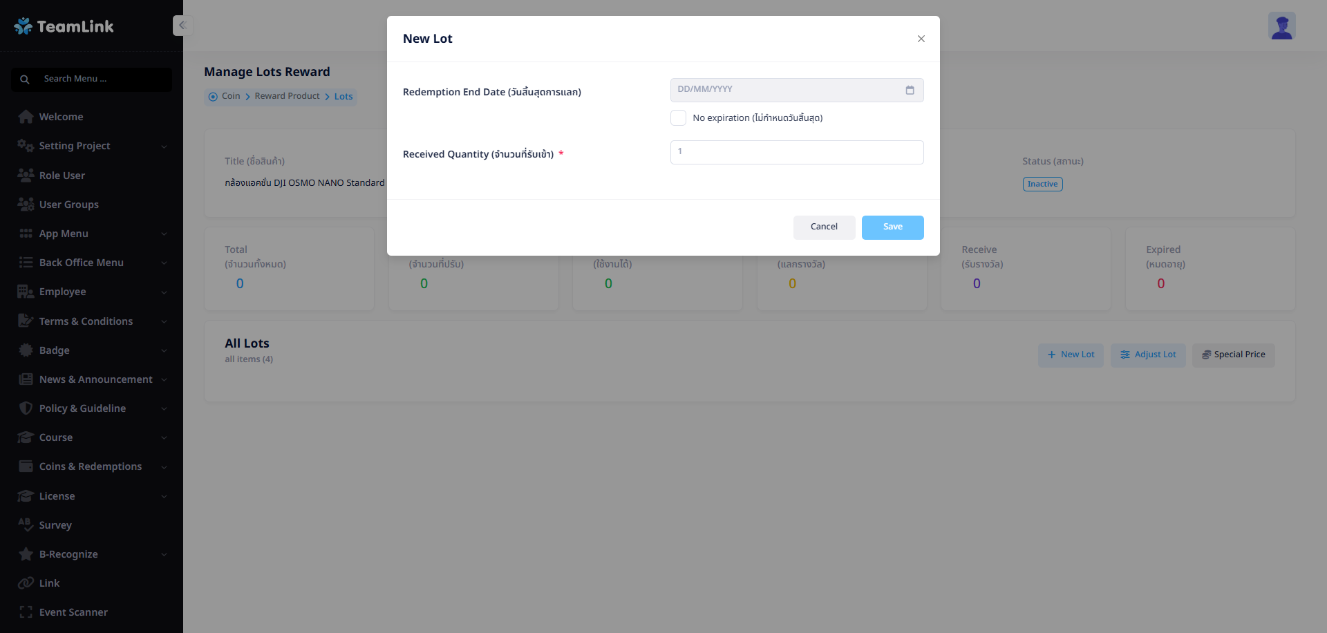 • Received Quantity (จำนวนที่รับเข้า) : คือจำนวนของรางวัลที่เปิดให้พนักงานเเลกได้