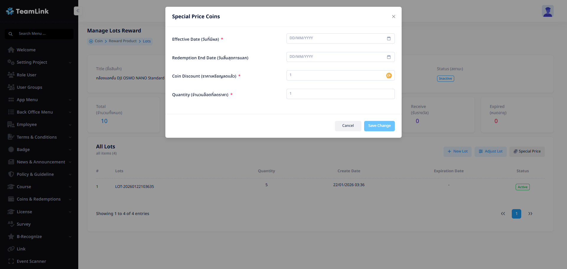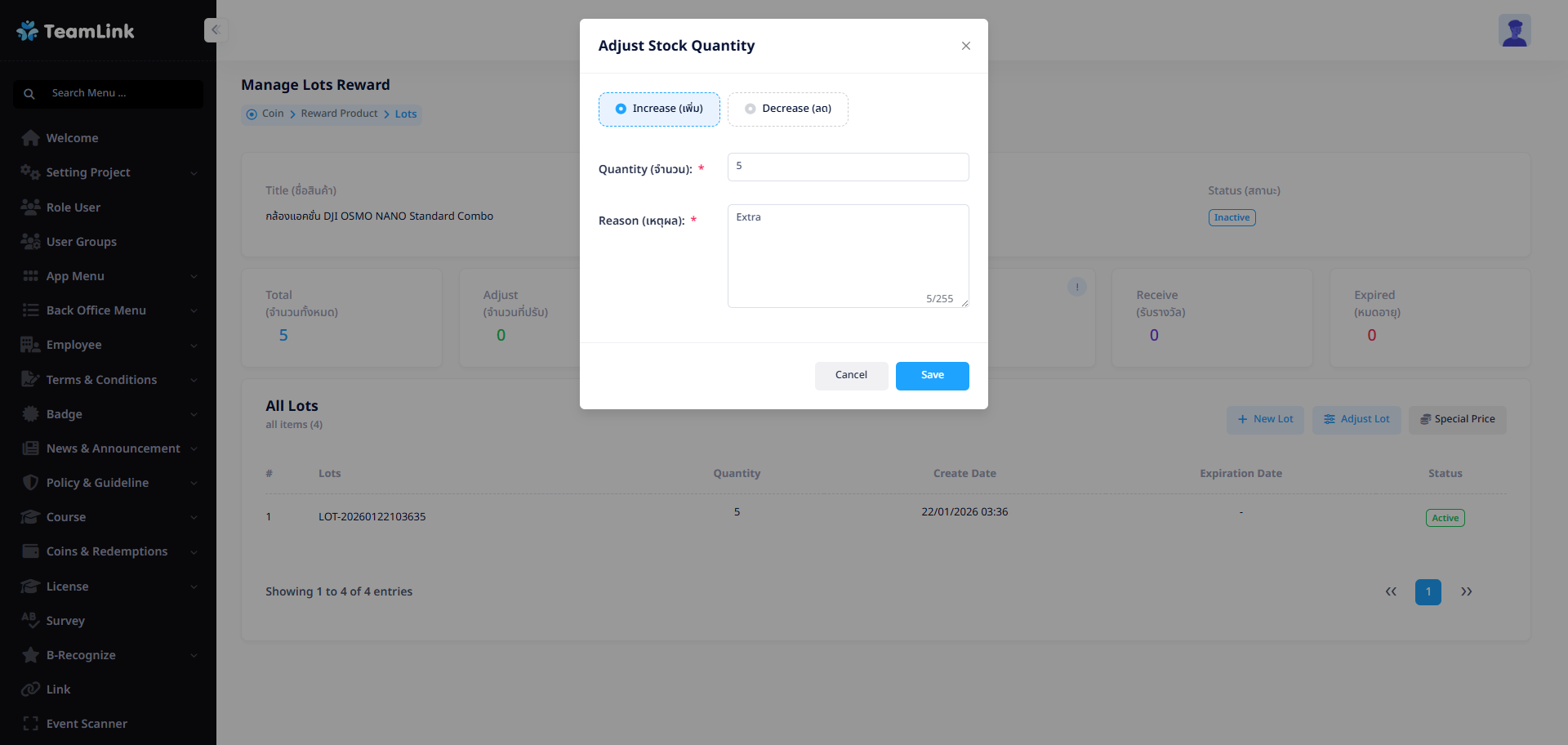 • Quantity (จำนวน): สามารถลดจำนวนของรางวัลได้ โดยจำนวนต้องน้อยกว่าที่เคยสร้างไว้