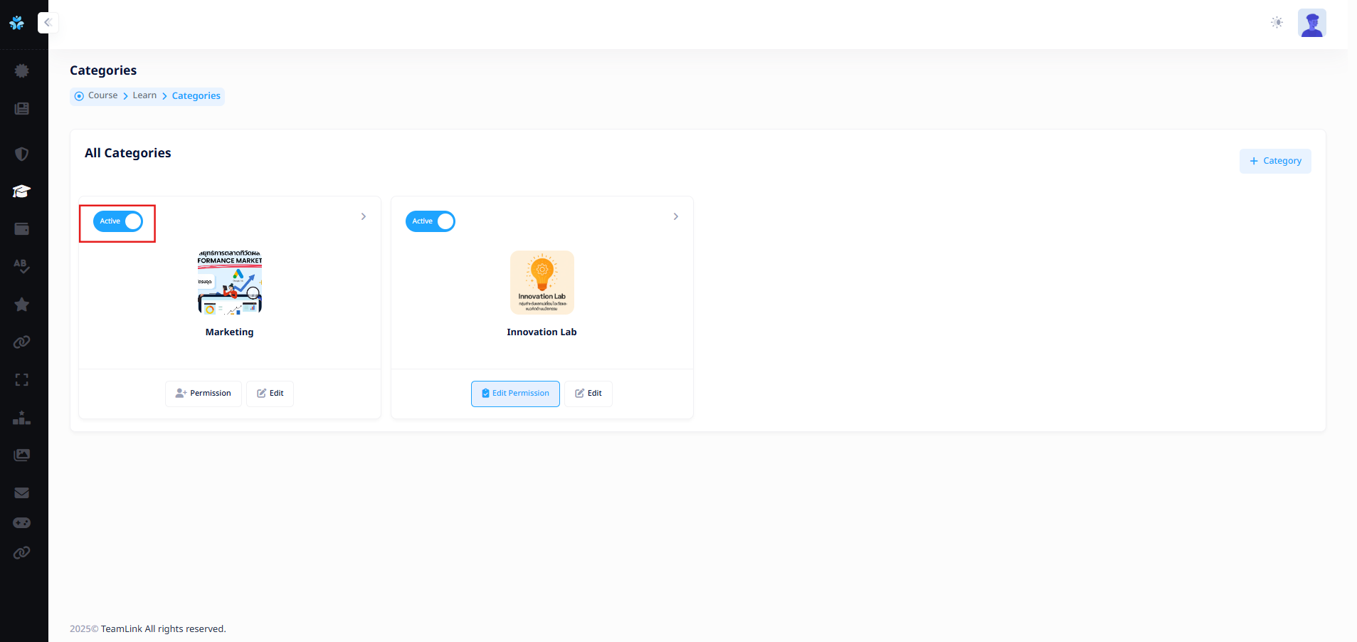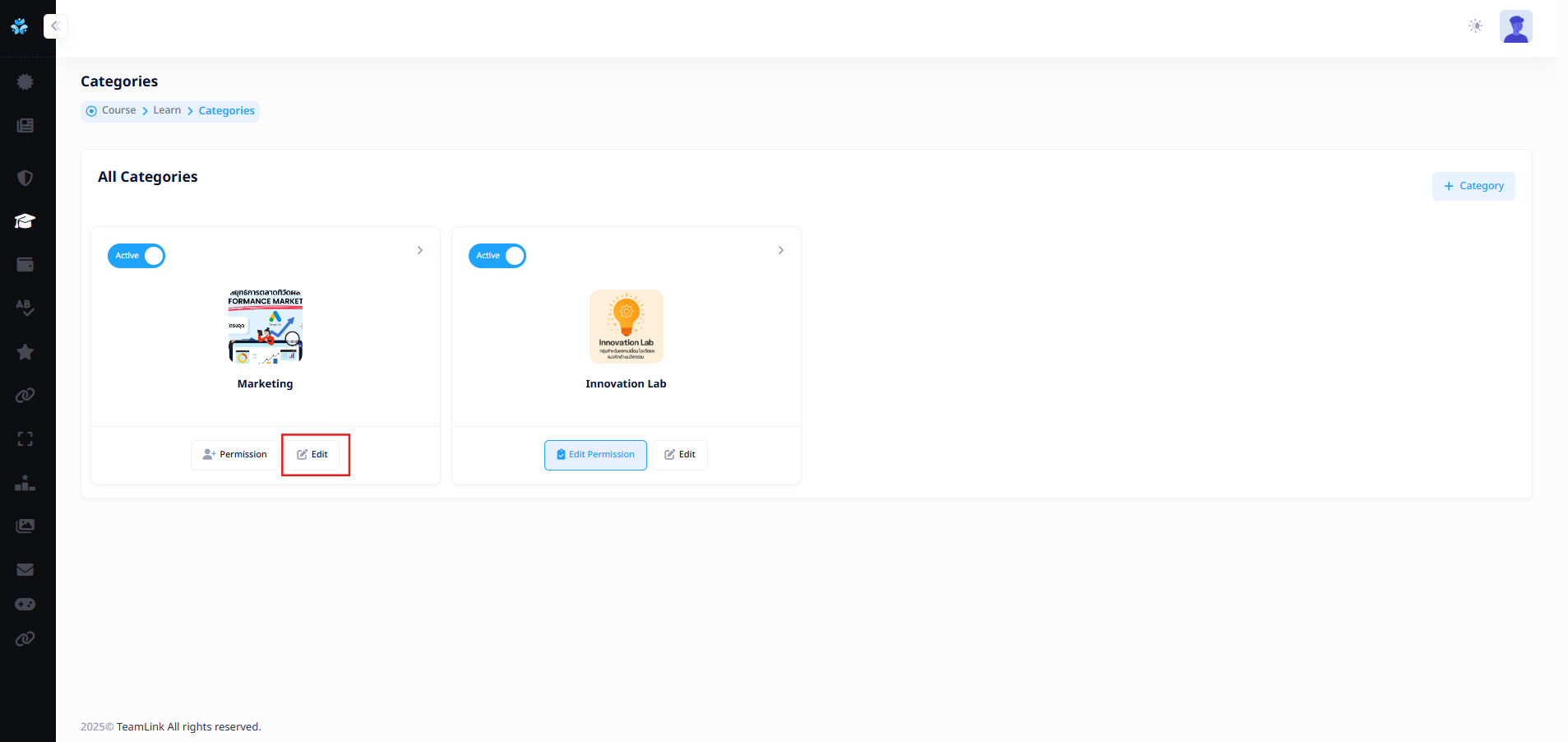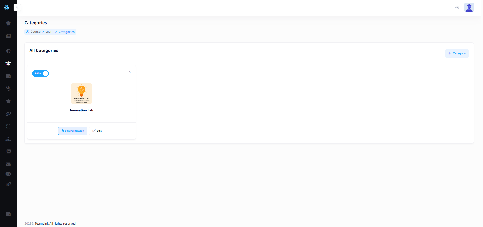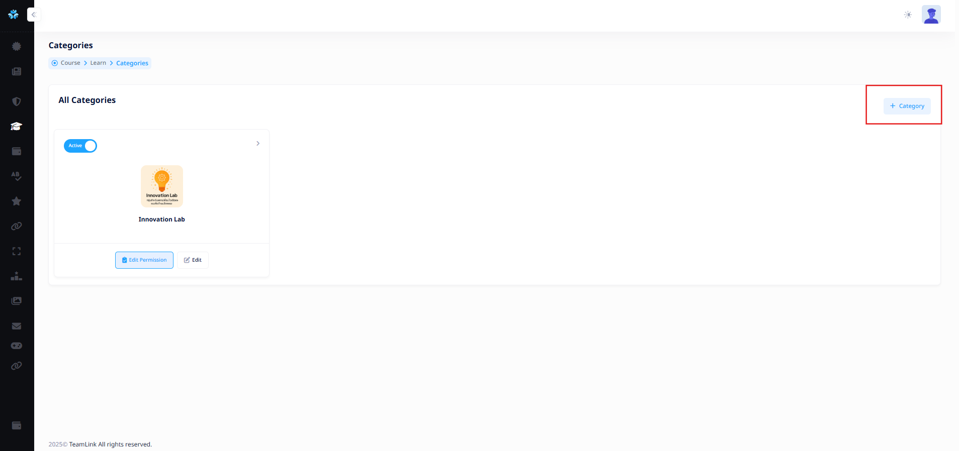 ผู้ใช้งานสามารถหมวดหมู่สำหรับคอร์สเรียนได้จากการกดปุ่ม "Category" ![]()
