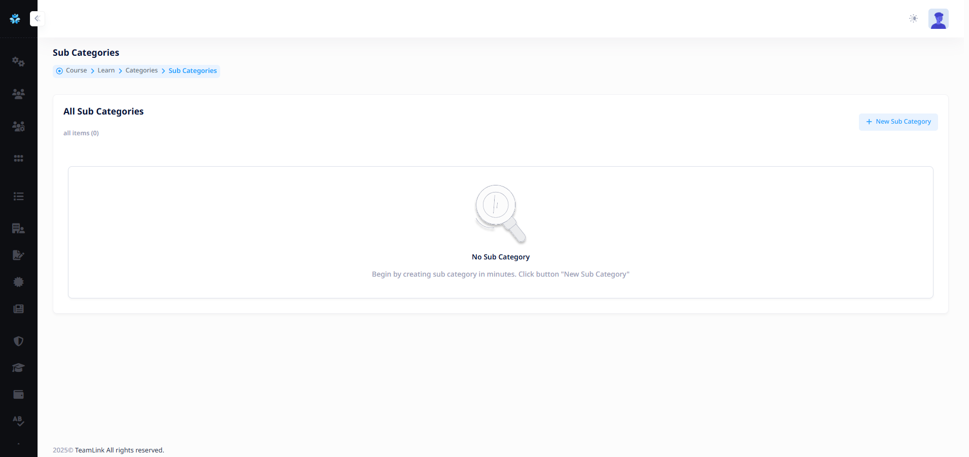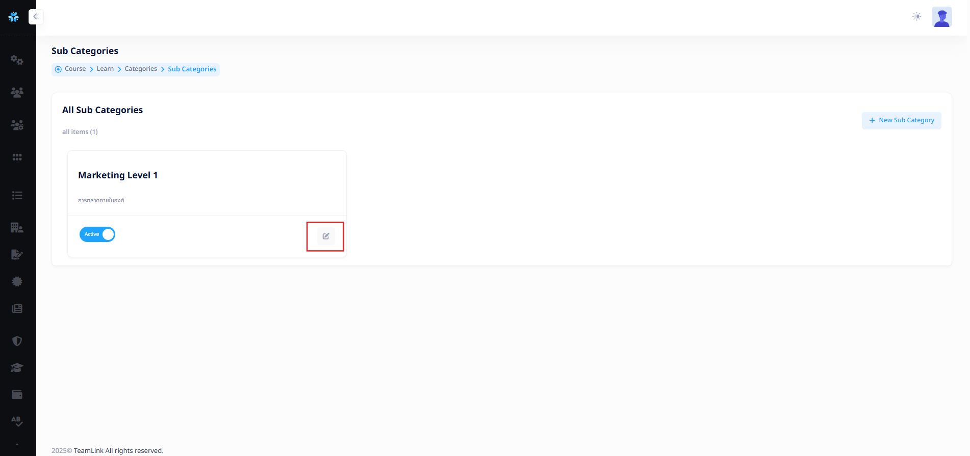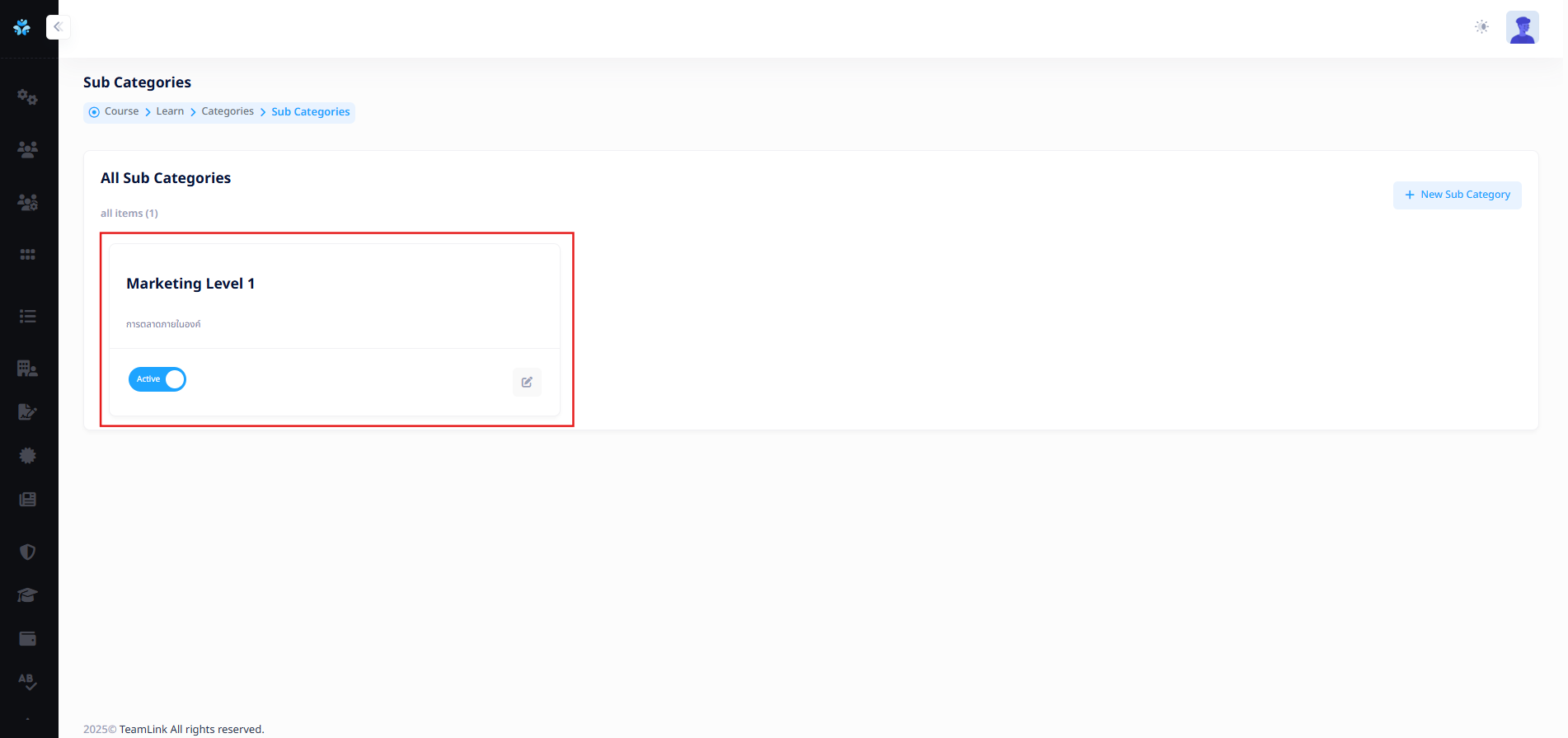 ผู้ใช้งานสามารถสร้างหรือไม่สร้าง Sub Categories ก็ได้ (วัตถุประสงค์มีไว้สำหรับนำคอร์สเรียนมาใส่) หากต้องการสร้างจะต้องกดปุ่ม "New Sub Category"