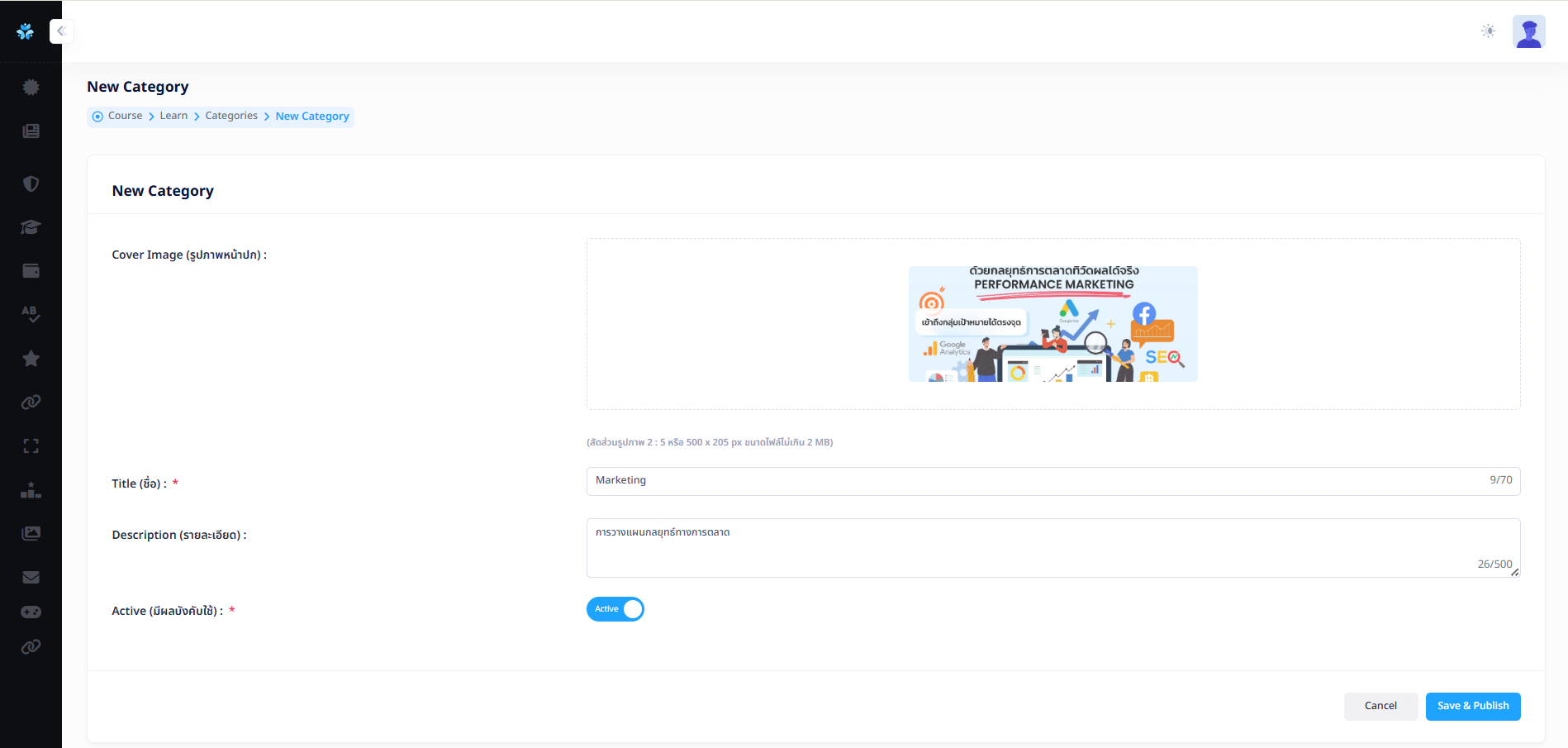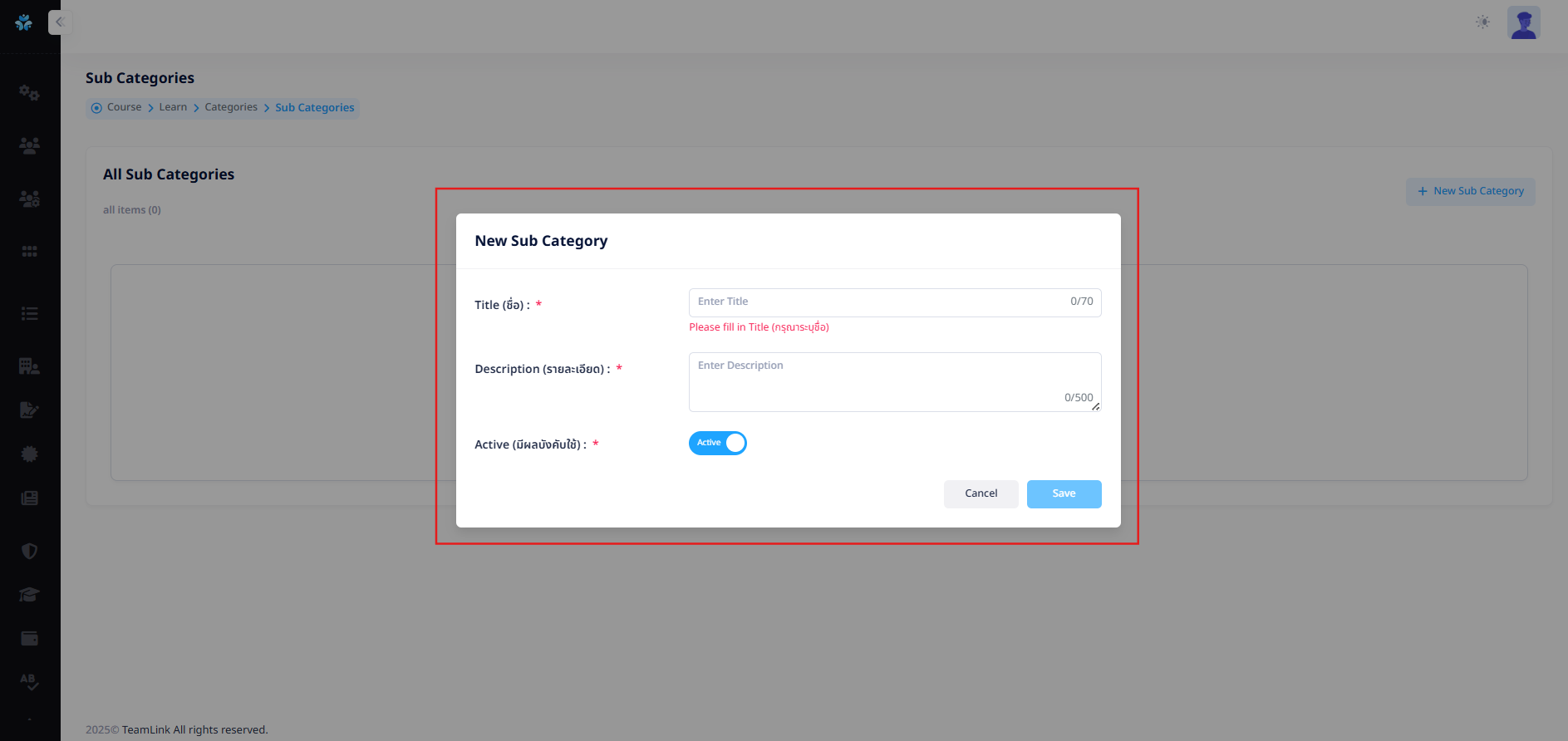 - Active (มีผลบังคับใช้) : สถานะเปิด-ปิด การใช้งานของ Sub Category