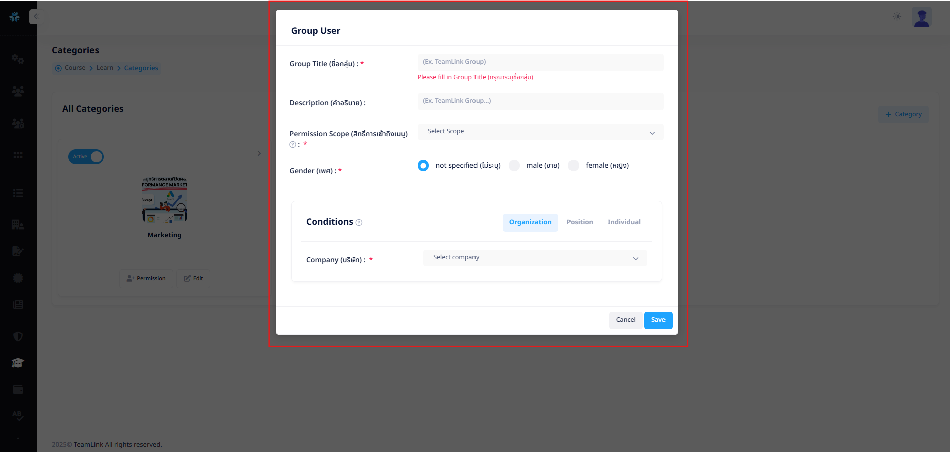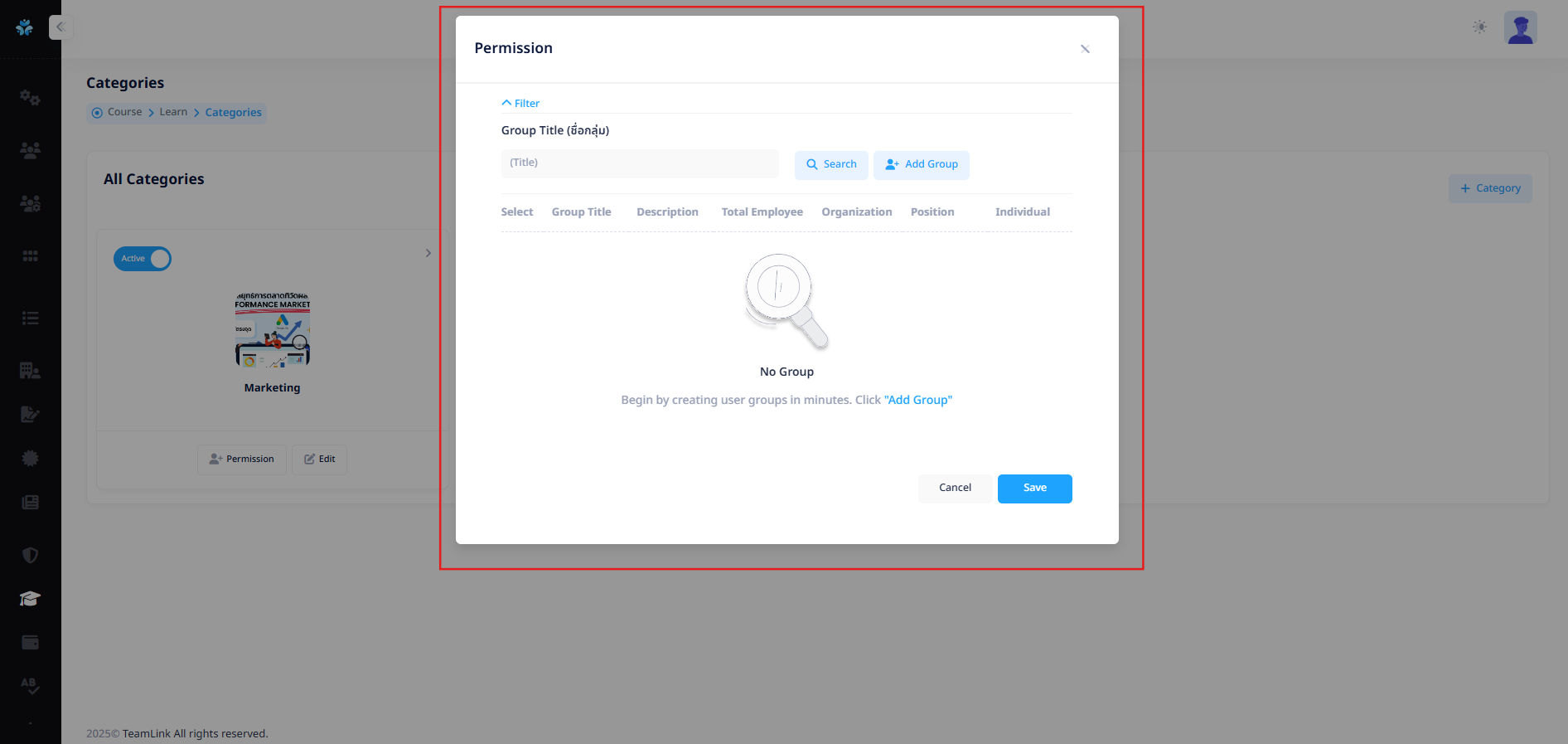 ผู้ใช้งานสามารถกด Search ชื่อกลุ่มที่เคยสร้างไว้ในระบบเพื่อทำการเลือกสิทธิ์การเข้าถึง Categories นี้ได้ หรือกดปุ่ม "Add Group"