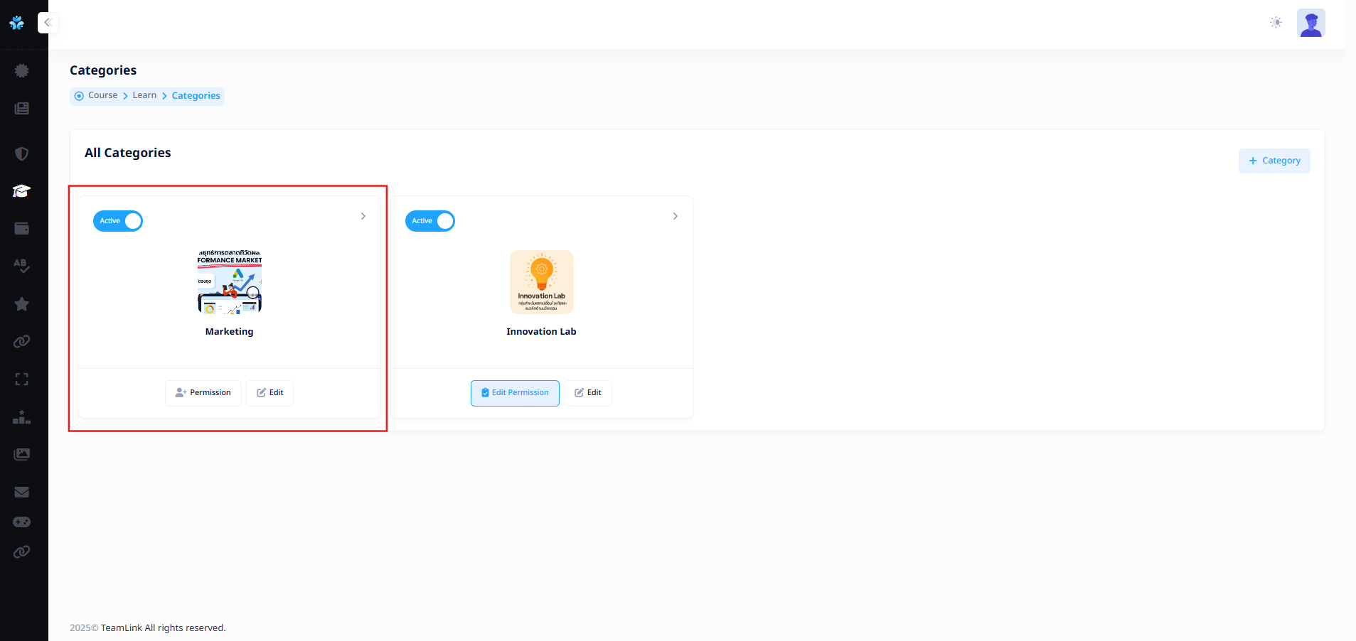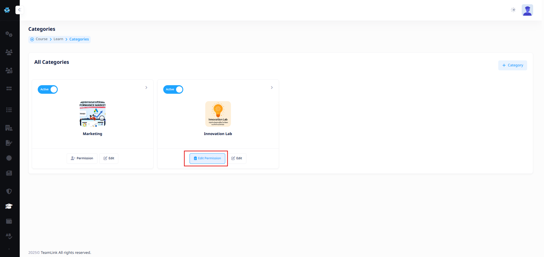หลังจากสร้างกลุ่มสำหรับเพิ่มสิทธิ์การเข้าถึง Categories ของ Learn เรียบร้อยแล้ว ระบบจะเปลี่ยนคำในปุ่มจากคำว่า "Permission"