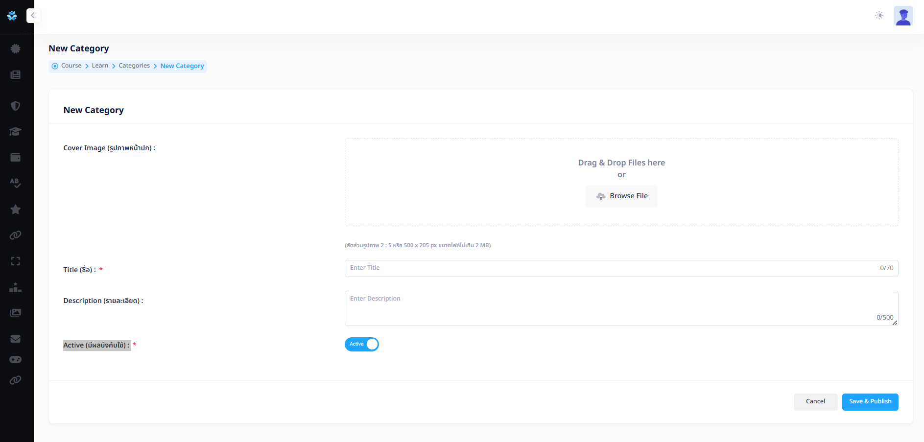 - Cover Image (รูปภาพหน้าปก) : สัดส่วนรูปภาพ 2 : 5 หรือ 500 x 205 px ขนาดไฟล์ไม่เกิน 2 MB