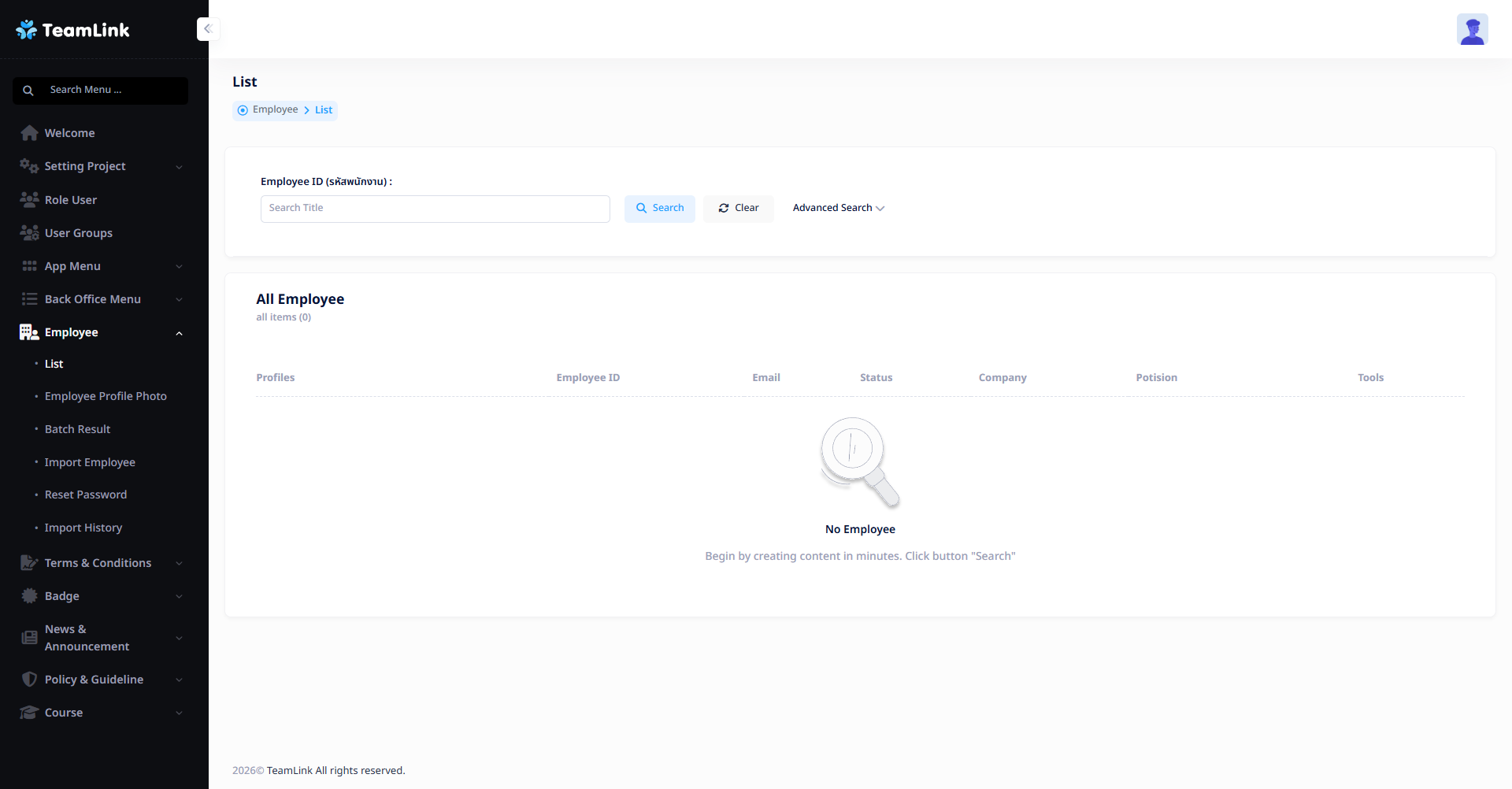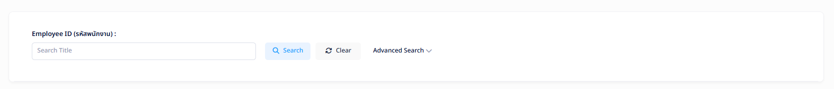 ผู้ใช้งานสามารถค้นหารายชื่อพนักงานได้ด้วยรหัสพนักงาน หรือใช้ Advanced Search เพื่อค้นหาตามเงื่อนไขต่อไปนี้