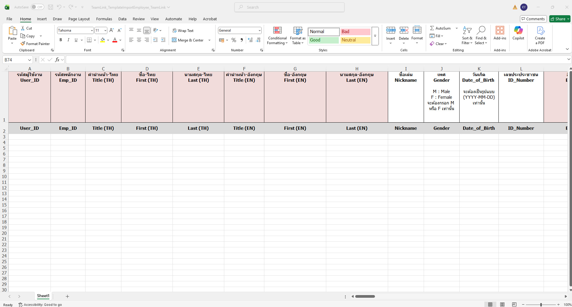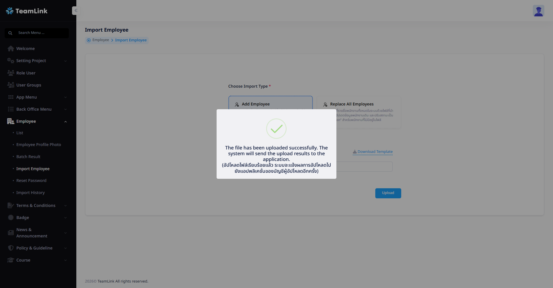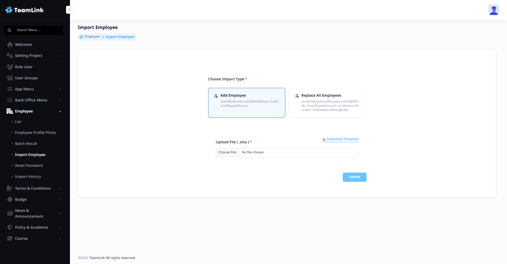 โดยผู้ใช้สามารถกดที่ปุ้ม Download Template เพื่อดาวน์โหลดไฟล์เทมเพลต .xlsx สำหรับนำไปกรอกข้อมูลรายชื่อพนักงานได้