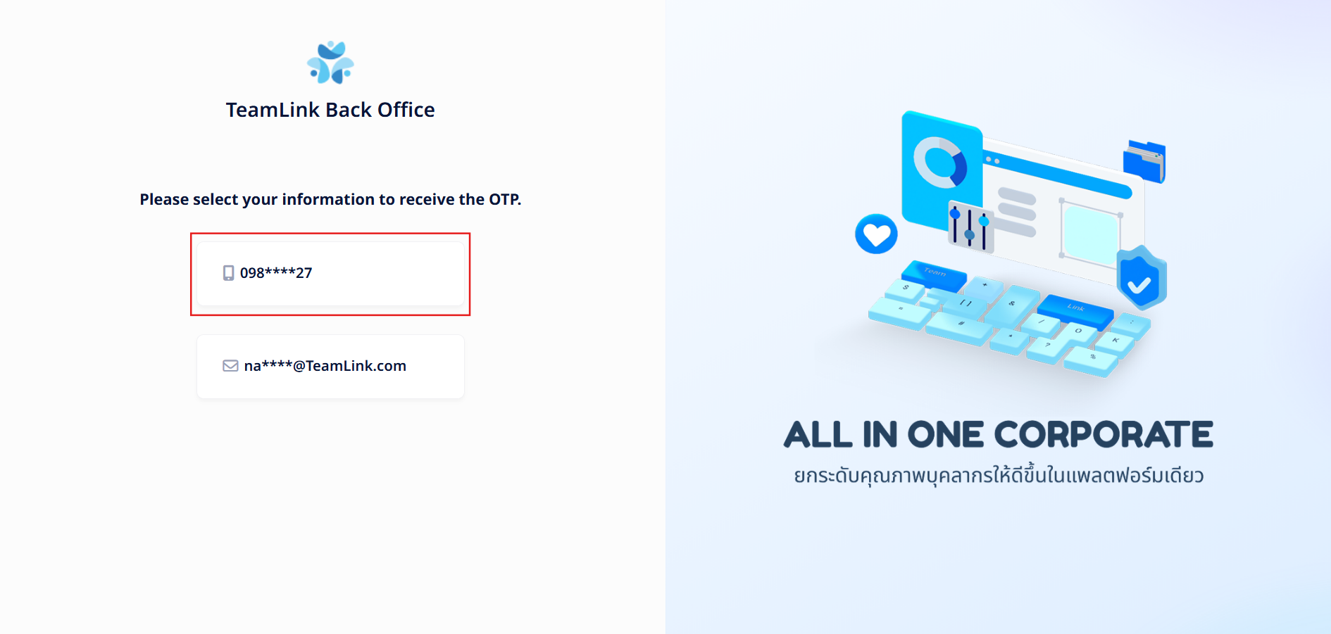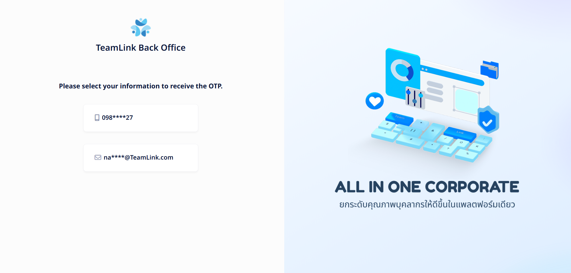 เมื่อผู้ใช้งานกรอก Username, Password และกดปุ่ม "Login" ระบบจะพาไปที่หน้าเลือกช่องทางการส่ง OTP เพื่อยืนยันตัวตน โดย OTP สามารถส่งไปยังช่องทางเบอร์โทรศัพท์ หรือช่องทางอีเมลได้