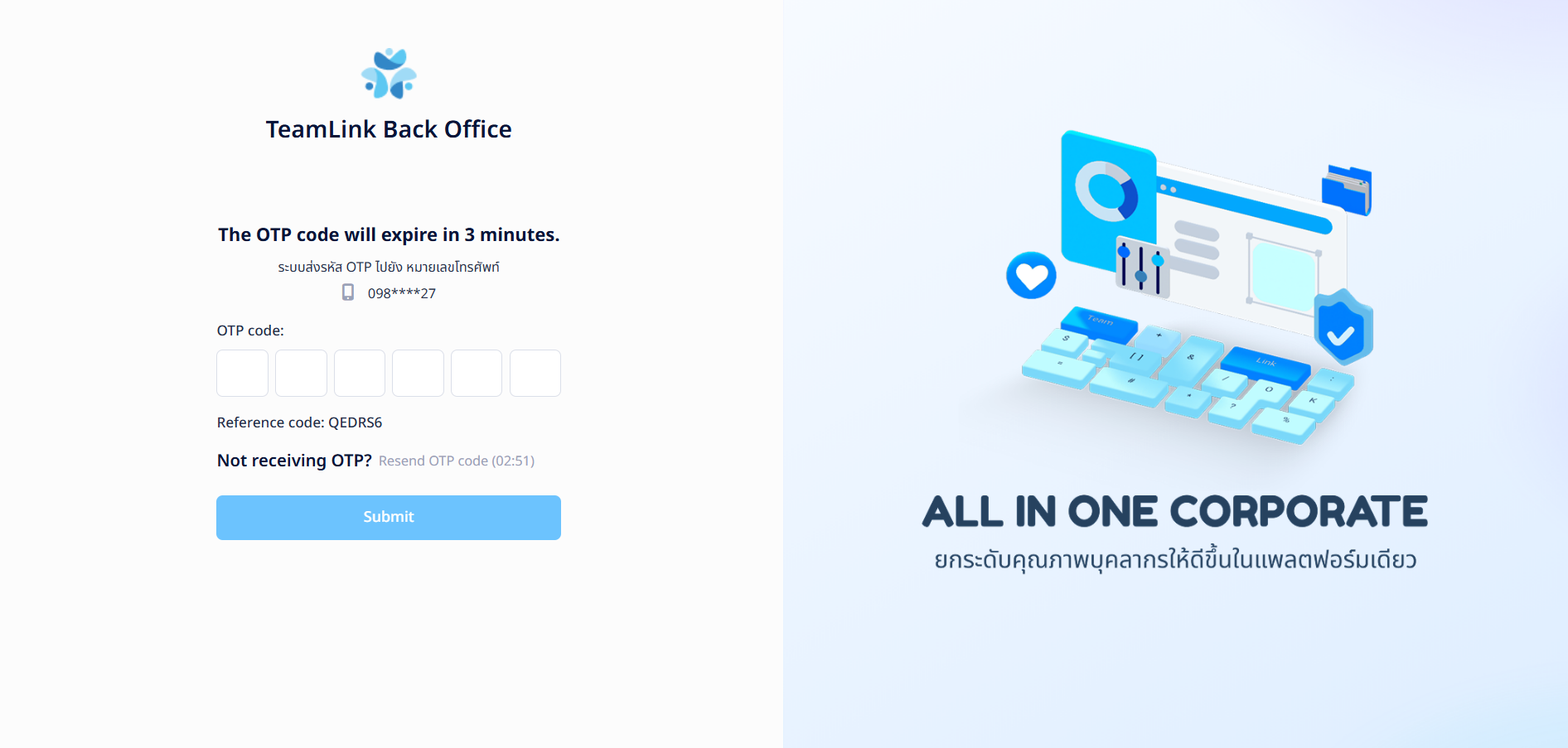 เมื่อกรอก OTP เรียบร้อยแล้ว จะสามารถเข้าสู่หน้าเว็ปของ Backoffice ได้