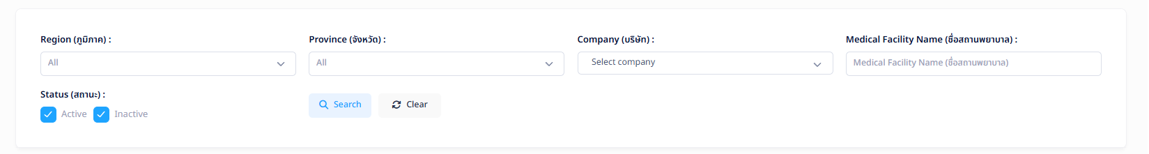 ผู้ใช้งานสามารถค้นหาสถานพยาบาลได้โดยพิมพ์ ชื่อสถานพยาบาล (Medical Facility Name) ที่ต้องการลงในช่องค้นหา และกดปุ่ม "Search" เพื่อแสดงผลลัพธ์ที่เกี่ยวข้อง และสามารถกดปุ่ม "Clear" เพื่อล้างการค้นหาก่อนหน้า